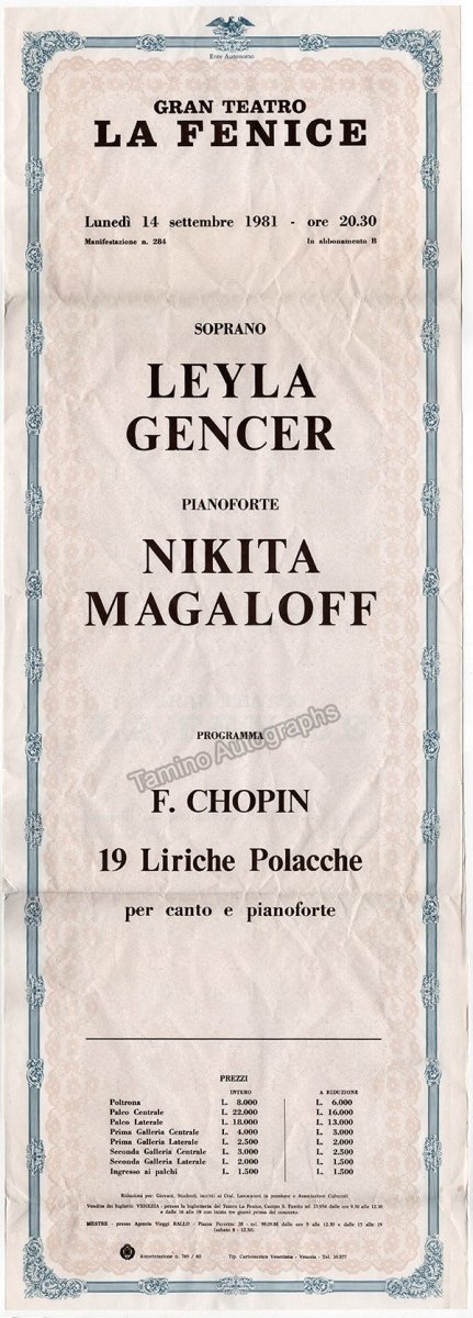 Gencer, Leyla - Magaloff, Nikita - Poster Announcement La Fenice 1981 + Signed Program! - Tamino Gencer, Leyla - Magaloff, Nikita - Poster Announcement La Fenice 1981 + Signed Program! - Tamino