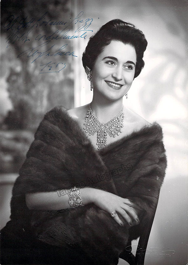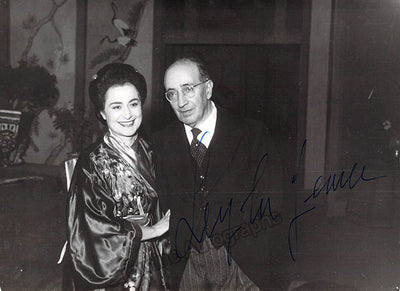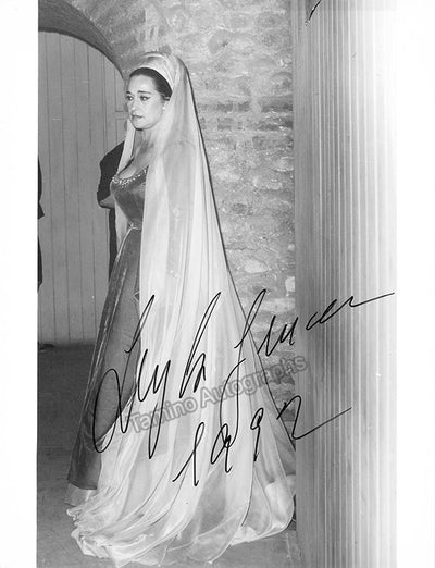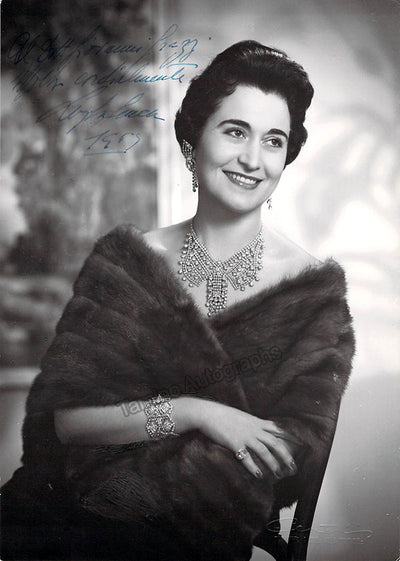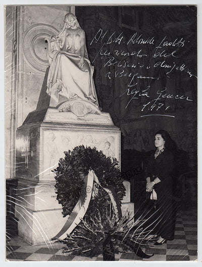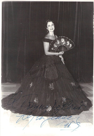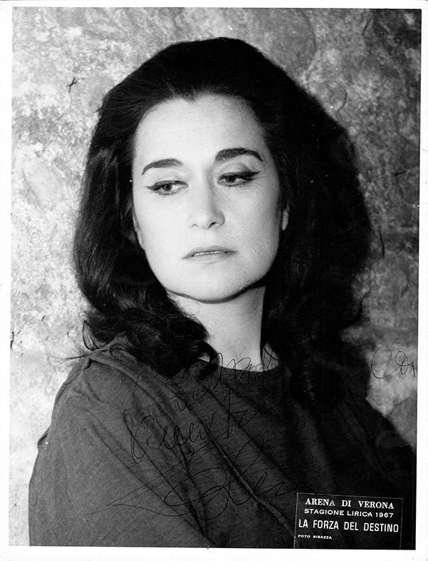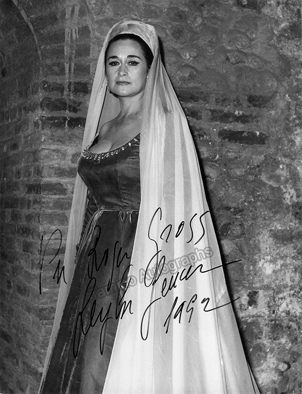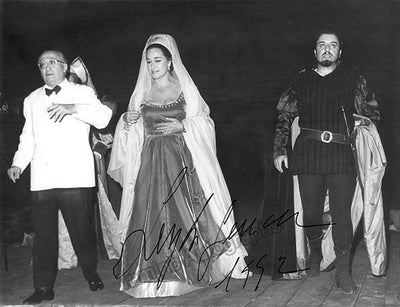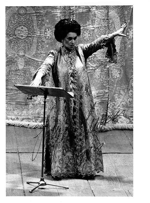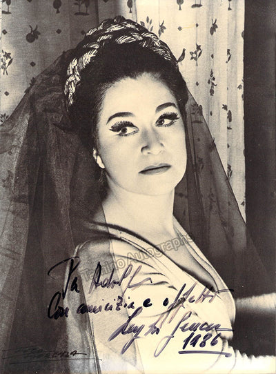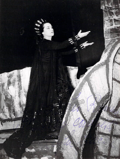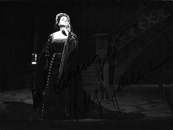 Signed photograph, shown in role in Donizetti's Maria Stuarda. Stamped on verso by photographer E. Piccagliani, Teatro La Scala, Milan. Size is 7 x 9.25 inches, mounting traces on verso, otherwise in excellent condition.