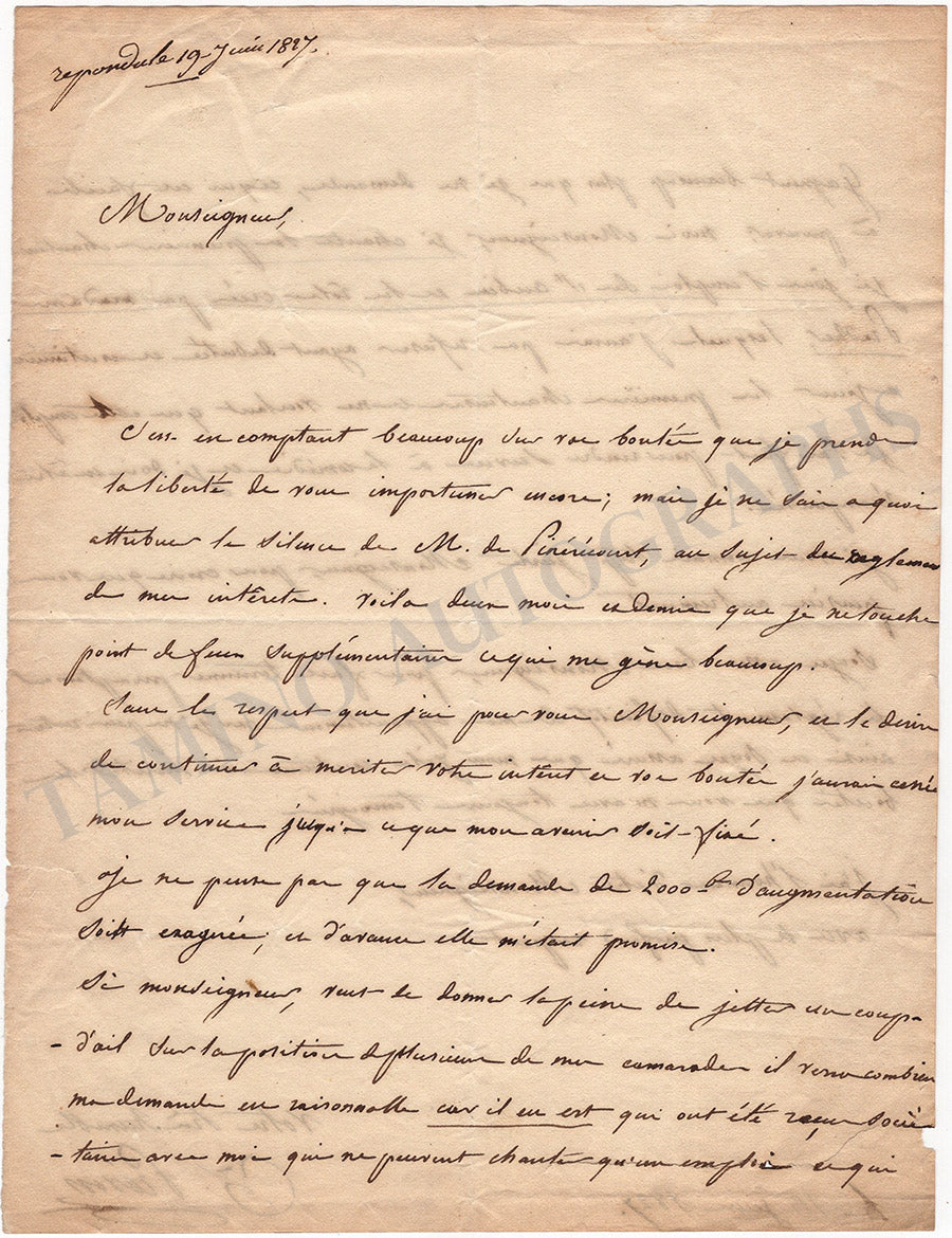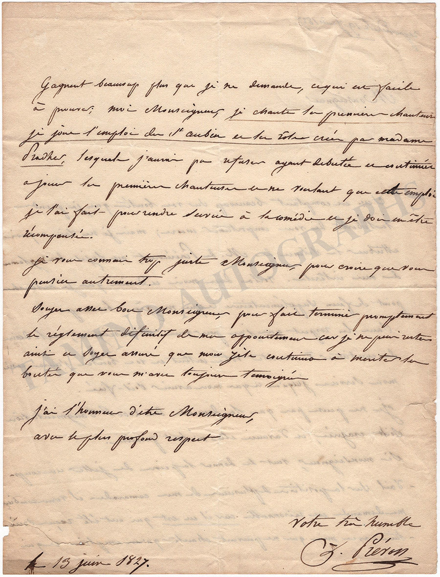Autograph letter in French (untranslated) signed by her, dated 1827, addressed to a gentleman, concerning a wage increase: “…je ne pense pas que la demande de 2000fr d’augmentation soit exagérée, et d’avance elle m’était promise (…) Je chante la première chanteuse, je joue l’emploi de St. Aubin et les rôles crées par Madame Pradher…”.