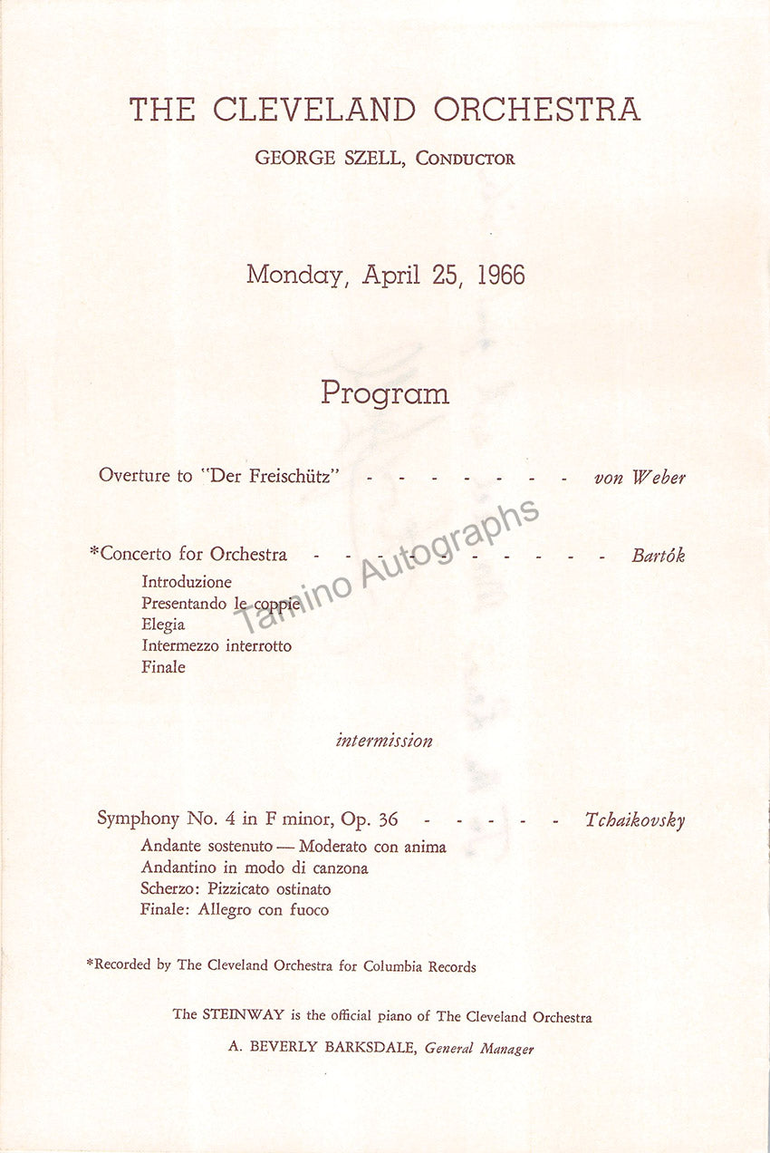Program for a performance of the star Hungarian-born American conductor with The Cleveland Orchestra in Arizona, US, April 25, 1966, signed and inscribed by him on the cover with a short sentiment.