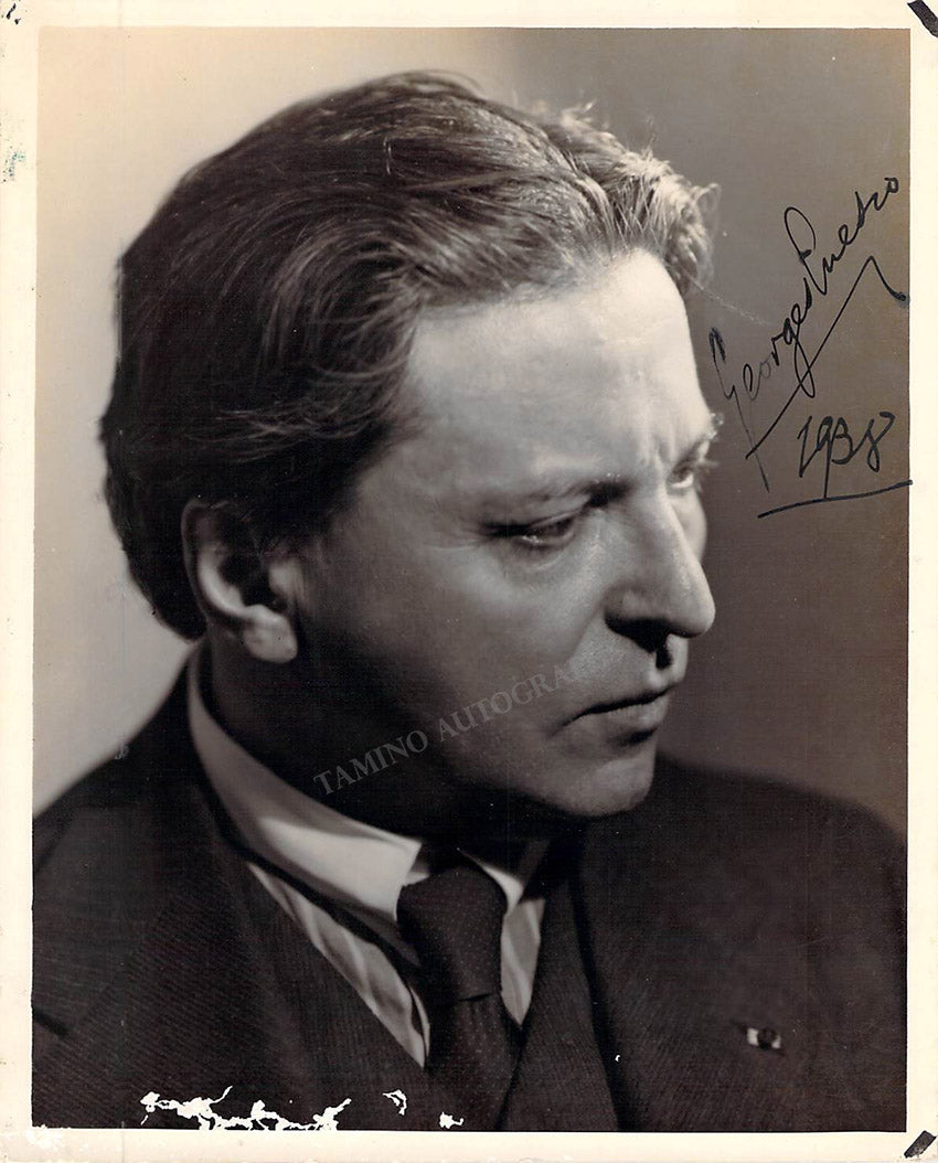 Fine black-and-white photograph signed by him in 1938; ink-stamped on verso by photographer Toppo (New York). Size is 8 x 9.8 inches, some damage by the bottom, in overall very good condition.
