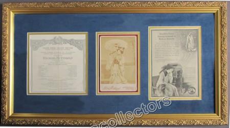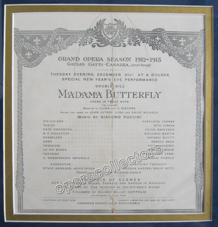 American star soprano (1882-1967) and film actress, an authentic opera diva on her time who recorded extensively and became extremely famous in her time. Beautiful signed cabinet photo by Dupont, showing her in the title role in Madama Butterfly, opera by Puccini. Also in the frame are a cast page for a performance of this this Opera at the Met opera with her in the title role, special New Year´s Eve 1912-13 performance and an ad from the 1910s showing her listening to her own records as Madama Butterfly!