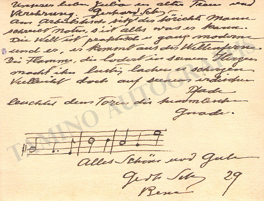 Autograph letter in German on the verso of a photograph of him shown at work on his desk, to a gentleman adding a 3-bar music quote from one of his works. Size is 4.5 x 3.4 inches, in very good condition.