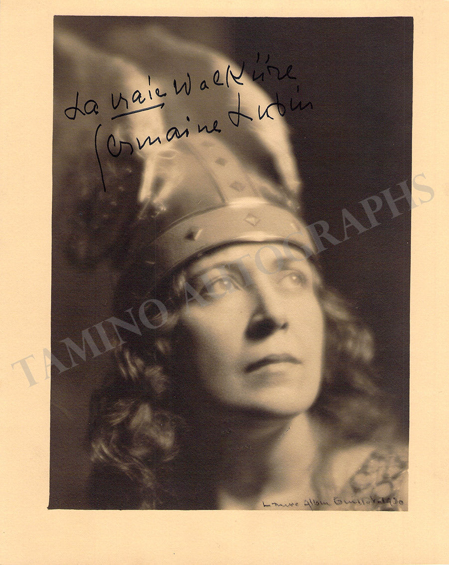 Fine sepia photograph signed by her with a short sentence "the true Walkure", shown as Brunhilde in Wagner's Ring. Size is 7.75 x 9.75 inches, in excellent condition.
