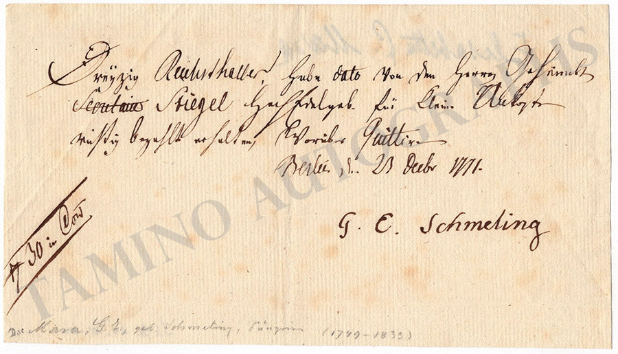 Autograph receipt for “Dreizehn Rechsthaler” signed “G. E. Schmeling”, dated Berlin December 23, 1771. Size is 7.2 x 4.1 inches, some creases, overall age toning, in very good condition.