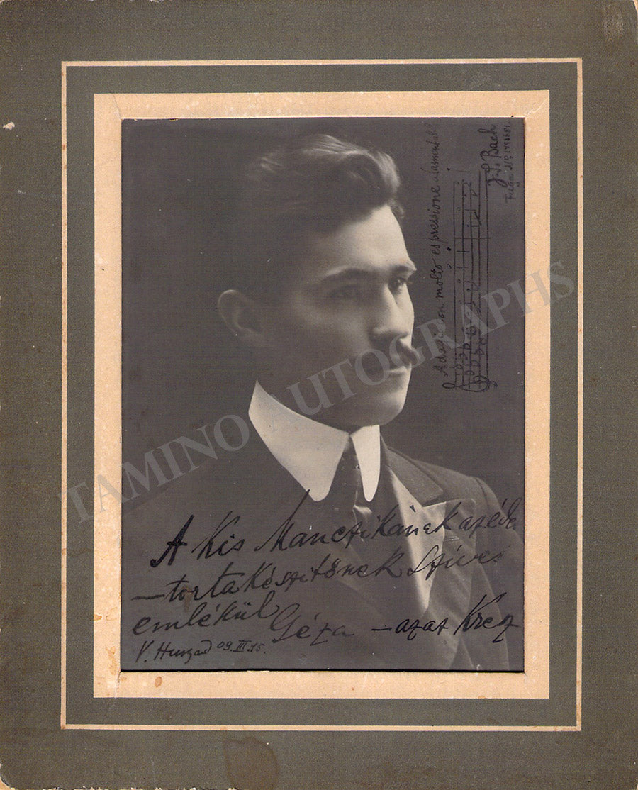 Fine black-and-white photograph signed and inscribed by him with a short sentiment dated in 1935 adding a 2-bar music quote from a fugue by J.S. Bach, mounted on a mat.  Total size is 5 x 6.2 inches, some silvering, in overall very good condition.