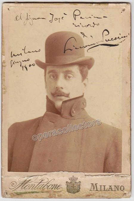 Very nice cabinet photo signed by the great Italian composer of operas (1858-1924). Size is 4.25 x 6.5 inches, inscribed, dated in Milan, June 1900. Beautiful, clear signature by Puccini on a photo showing him young. Cabinet photo is perforated in the 4 corners, has a fold at the bottom, mounting traces on verso, priced accordingly - will show really fantastic if framed .