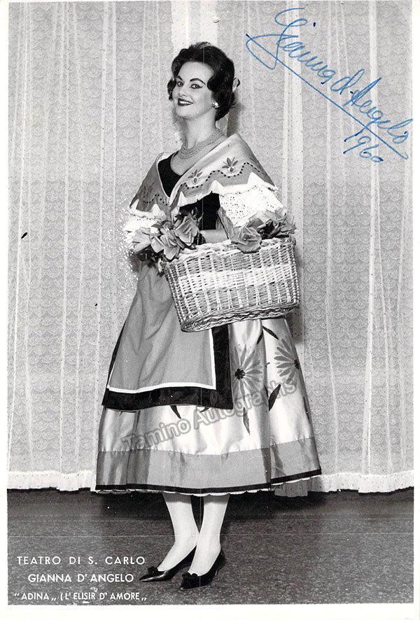 Signed photograph, shown as Adina in Donizetti's L'Elisir D'Amore, dated in 1960. Stamped on verso by photographer Troncone, Naples. Size is 4.75 x 7 inches, in very good condition.