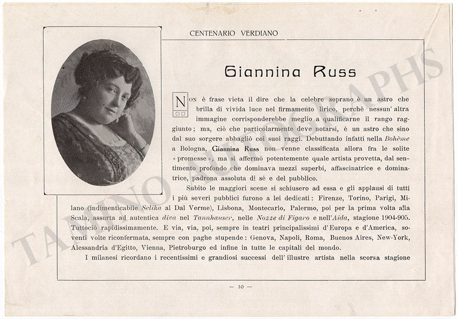 ALSO INCLUDED is a printed flyer introducing the soprano on the occasion of Verdi’s Centenary in 1913. 2 pp. In-4.