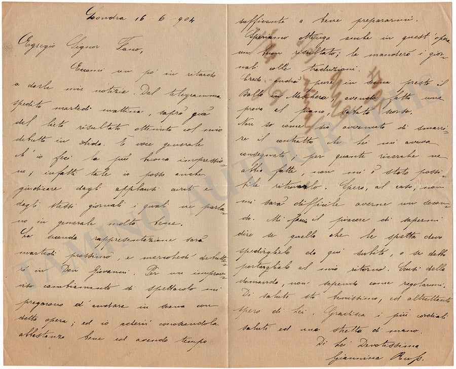 Fine autograph letter in Italian (untranslated) signed by her, dated in London, June 16, 1904, to the impresario Fano: “…È voce generale ch’io feci la più buona impressione; infatti tale io posso anche giudicare dagli applausi avuti e dagli stessi giornali i quali ne parlano in generale molto bene. La seconda rappresentazione sarà martedì prossimo, e mercoledì debutterò in Don Giovanni…”. Open size is 8.9 x 7.1 inches, two written pages in one folded sheet, some rust stains, in overall very good condition.