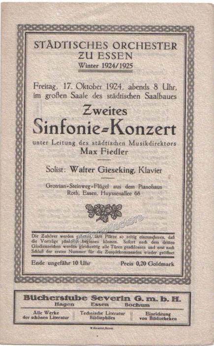 Concert with Max Fiedler and Julius Kopsch conducting his piano concerto City Orchestra of Essen, Respighi Kopsch Reger Beethoven, 4 pages with full page announcement with complete program details of a recital by Emil von Sauer