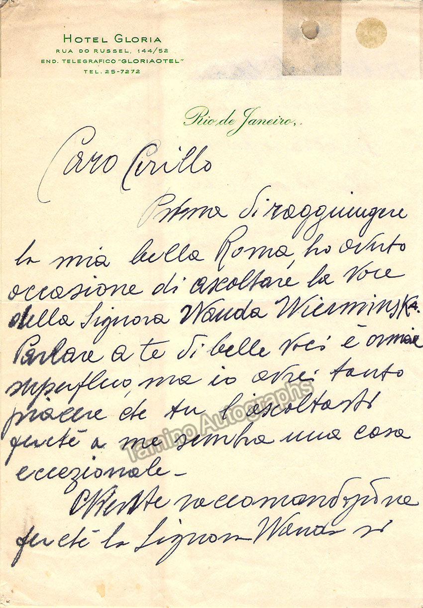 Italian superstar tenor (1890-1957), one of the greatest tenors of all time, often regarded as "the second Caruso". Autograph letter signed, 2 pages, written in Italian on the letterhead of the Hotel Gloria, Rio de Janeiro in 1947, sold untranslated. Size of each page is 5.5 x 8 inches, small creases on edges and small stain on bottom of the first page, otherwise in very good condition.