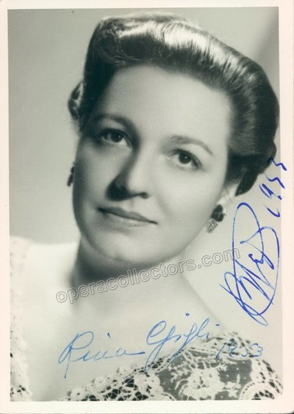 signed photo as herself - Rina Gigli was a singer and daughter of star tenor Beniamino Gigli and sang with him many times, 4 x 5.75 inches, stamped on verso by photographer Renzo Cinti, Rome