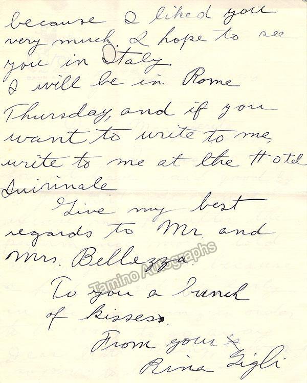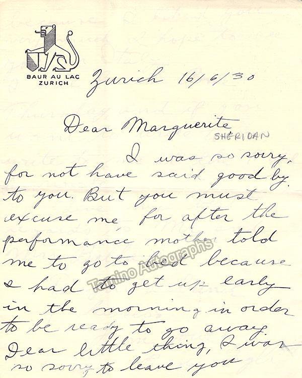 Italian soprano (1916-2000), daughter of the superstar tenor Beniamino Gigli. Autograph letter signed, written on the stationary of the Baur Au Lac Hotel in Zurich, dated in 1930, written in English and addressed to the Irish soprano Margaret Sheridan (1889-1958) (Rina Gigli was fourteen years old at this time and traveling with her parents). Text is on 2 pages of a 4 page sheet, (each page size is 5.75 x 7.25 inches), in excellent condition.