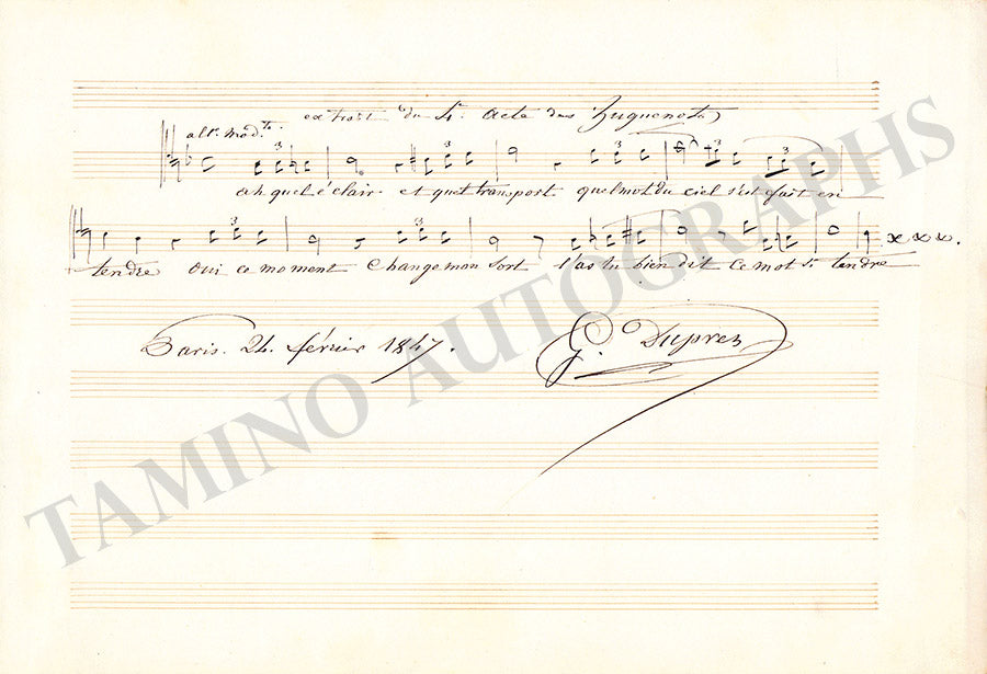 10-bar autograph music quote from Meyerbeer's Les Huguenots signed by him in Paris, on February 24, 1847. Size is 9.75 x 6.6 inches, in excellent condition.