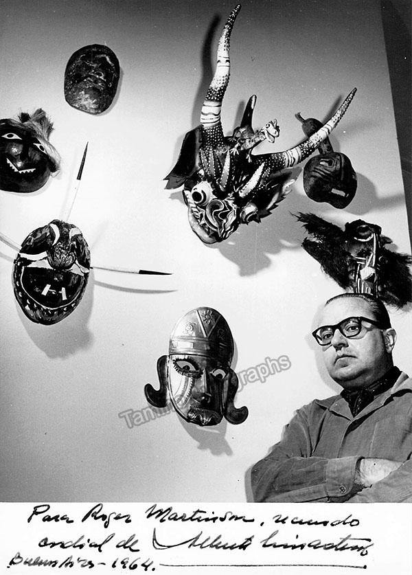 Argentine composer (1916-1983), regarded as one of the most important composers of the Americas in the XX century.  Signed photo, inscribed and dated in Buenos Aires, 1964.  Photo is ink-stamped on verso by Foto Estudio Fotesa and photographer Bruno Guth, Buenos Aires. Size is 4.9 x 6.8 inches, in very good condition.