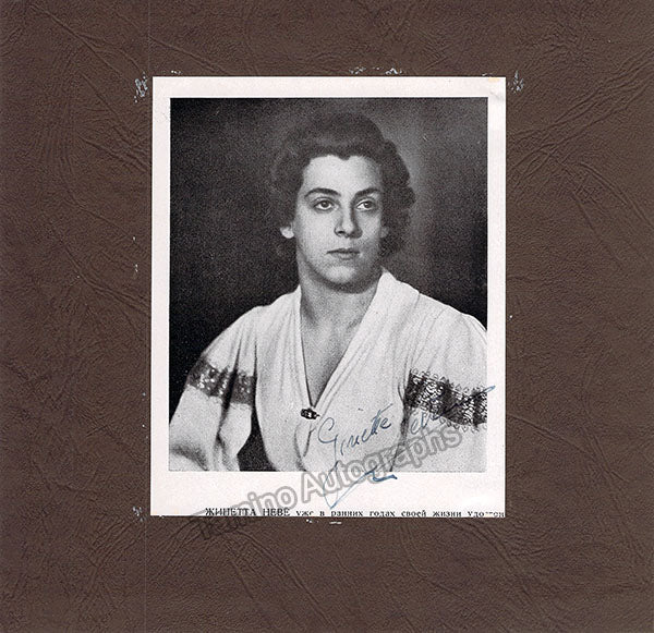 Fine black-and-white half-tone photograph (probably from a program or magazine) signed by her and mounted on soft cardboard. Total size is 8.25 x 7.9 inches, 4.4 x 5.5 inches (photo), in excellent condition.