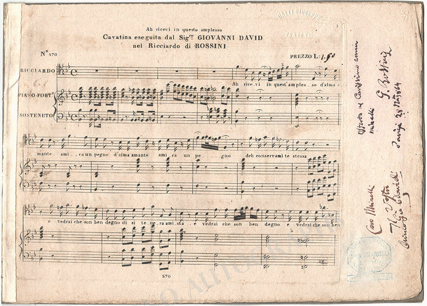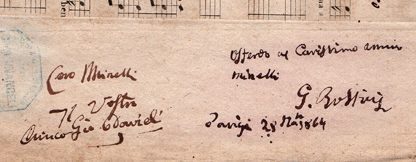 Signed by the composer and the role creator on the first page of the score, an engraving print of 6 pages, with both signatures on the first page. Rossini dated his signature in Paris in 1864, both men inscribed this to Minelli - obviously, Rossini´s friend called Napoleone Minelli, an opera fan.