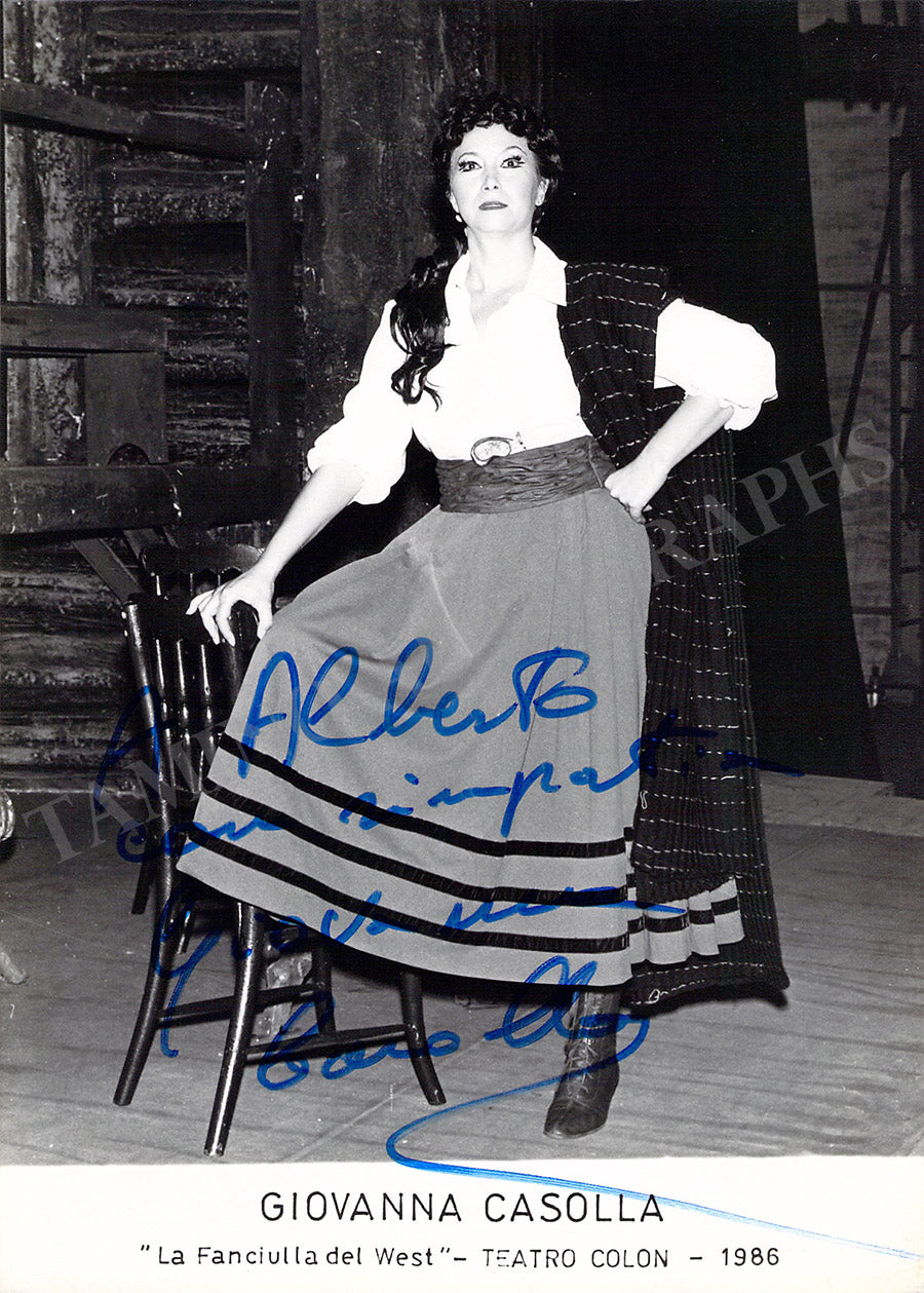 Fine black-and-white photograph signed and inscribed by her with a short sentiment, shown as Minnie in Puccini's La Fanciulla del West at Teatro Colon, Buenos Aires, 1986. Size is 4.9 x 7 inches, in excellent condition.