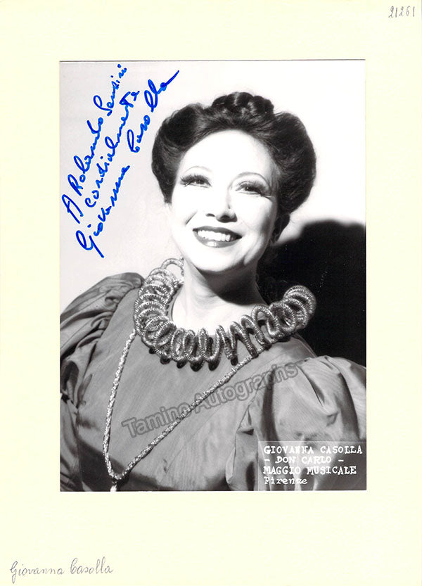 Fine black-and-white photograph mounted on soft cardboard, signed and inscribed by her, shown in costume as Elisabetta in Verdi's Don Carlo. Size is 5 x 7 inches (photo), total size is 6.75 x 9.5 inches, in excellent condition.