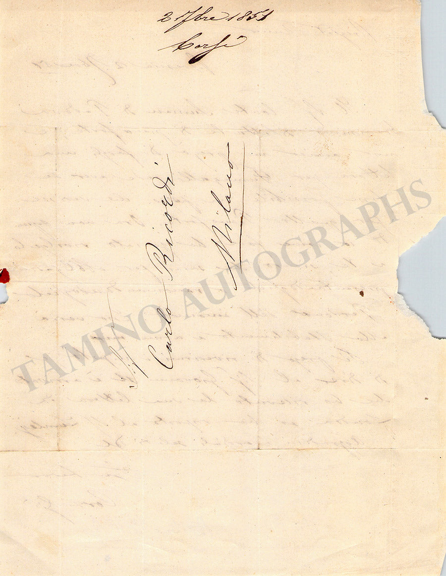 Autograph letter in Italian (untranslated) signed by him and dated in Brescia, 1851. Size is 6.9 x 9 inches, evident loss of paper over the left margin, otherwise in very good condition.