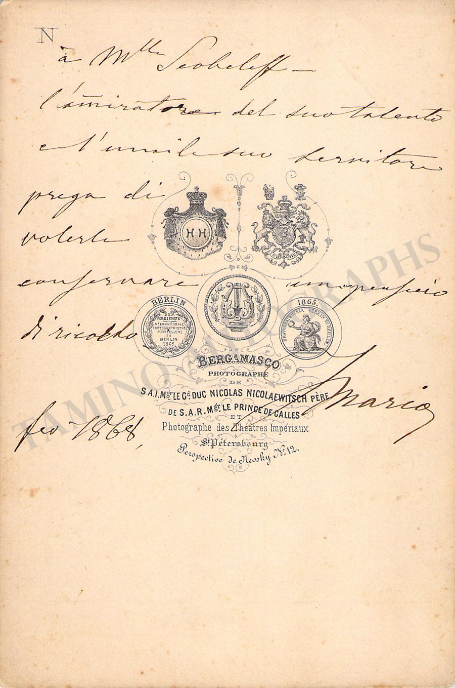 Beautiful vintage cabinet photograph of the tenor shown in role by photographer Bergamasco signed by Mario on the front and also signed, inscribed with a short sentiment in Italian on verso, dated 1868. Size is 4.25 x 6.4 inches, in very good condition.