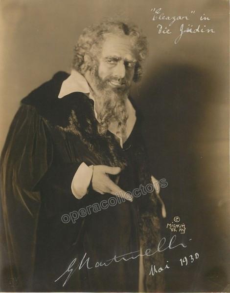 Italian tenor (1885-1969) who had a long and very successful career at the Metropolitan Opera in New York, also appearing in many other major international opera theaters. Beautiful double-weight photo, original by Mishkin, signed by him. Shown as Eleazar in La Juive, opera by Halevy, at the Metropolitan Opera. Martinelli wrote the name of the role and the opera at the top right, and dated under his autograph in May 1930. This was one of his most legendary roles - Highly desirable and rare!