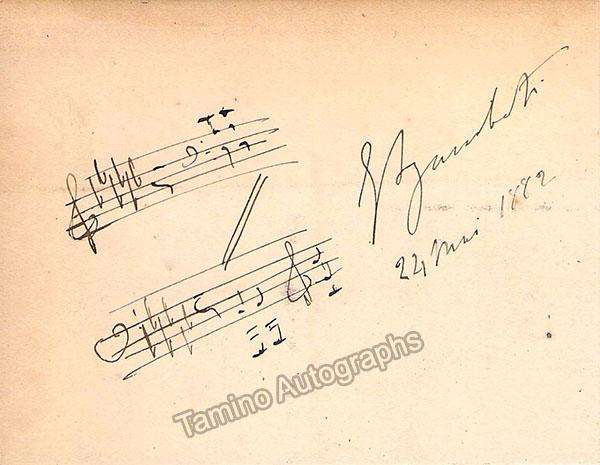 Autograph music quote signed in 1882 with some bars from an unknown piece. Size is 4 x 3.1 inches, minor rust stains, otherwise in very good condition.