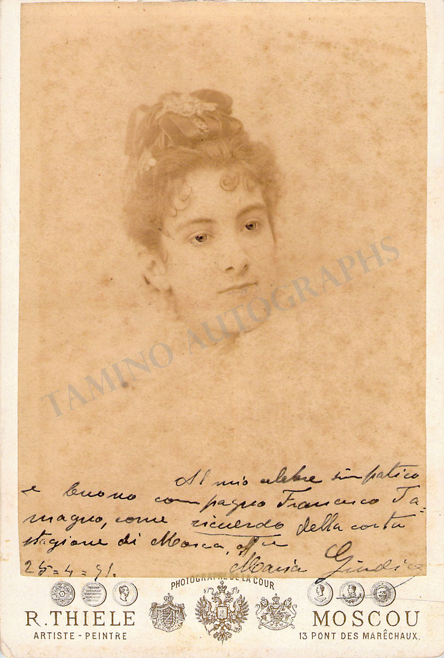 Portuguese mezzo-soprano (1870-1953), signed cabinet photograph inscribed with short sentiment dated in 1891, photo sketch on front shows her as herself; photo by R. Thiele, Moscow. Size is 4.25 x 6.25 inches, very small crease on bottom left, otherwise in excellent condition.