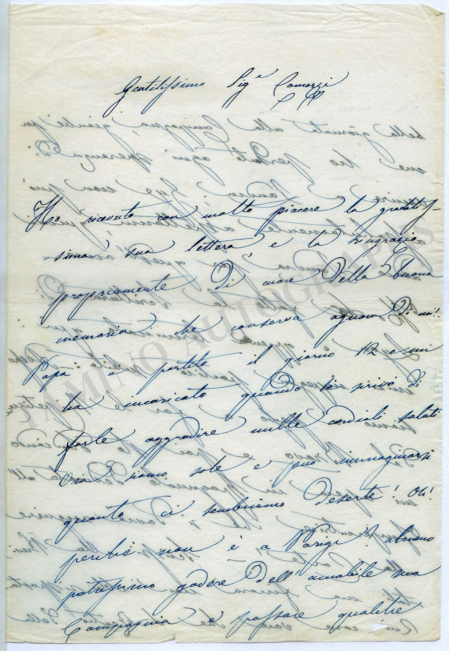 Rare autograph letter in Italian (untranslated) signed by her, dated in Paris, April 15, 1855, where she addresses Mr. Camozzi: “…Ho già fatto la scrittura di Lon e appena terminato qui i miei impegni partirò subito. Adesso siamo a presso a far le ripetizioni del Bravo e poi sto studiando un’opera in spagnuolo dedicata all’Imperatrice che si dovrà eseguire alla Corte. Scrissi alla Previtali ma finora non ebbi risposta. Qui corre voce che il Teatro della Regina l’aprano ancora…”.