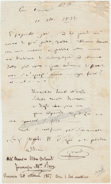 Autograph letter signed by Verdi, sent to his friend Francesco Maria Piave (who wrote nothing less than 10 librettos for his operas!). Letter is also signed and inscribed at the lower left by Piave and given to another person. One page, written on both sides, signed G. Verdi, 5 x 8.25 inches, dated in October 1857. Item is in excellent condition. Correspondence signed by both is very rare