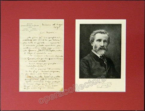 Autograph letter, handwritten by the great composer, mounted on mat with a very nice print (which includes a facsimile signature). Letter is untranslated and unsigned, one page, has letterhead of the Grand Hotel de Milan where Verdi stayed many times when he was in Milan. Dated in March 1898, this is a letter draft with some corrections and was probably torn appart by the composer, glued back together by unknown hand.