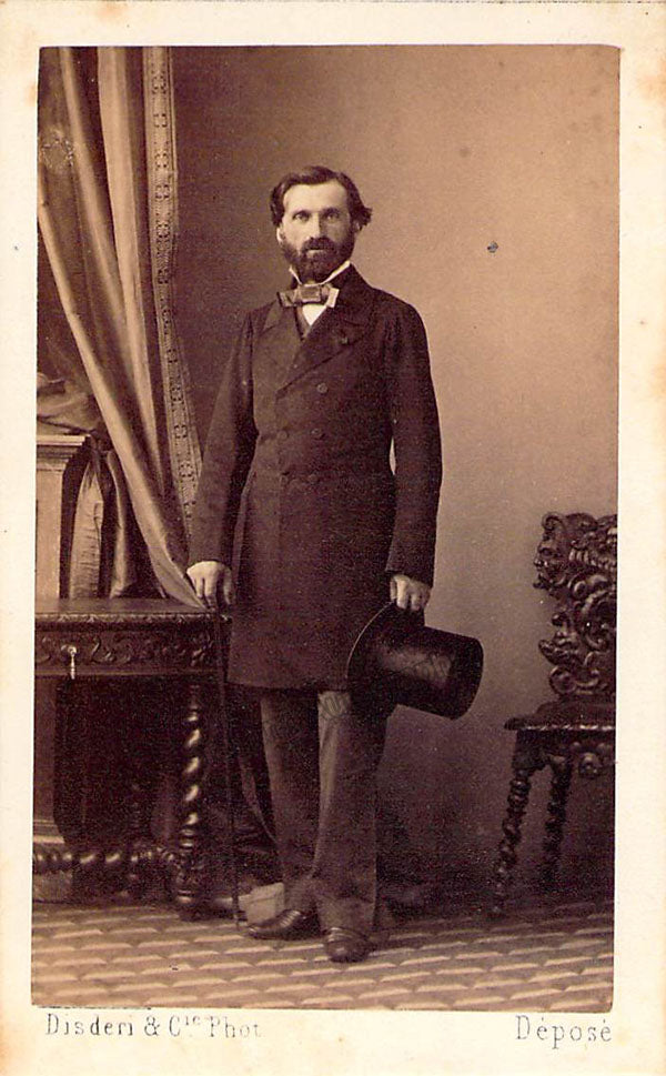 Beautiful vintage and unsigned carte-de-visite (CDV) photo by photographer Disderi (Paris) featuring Verdi in his younger years. Size is 2.3 x 4.25 inches, in very good condition.
