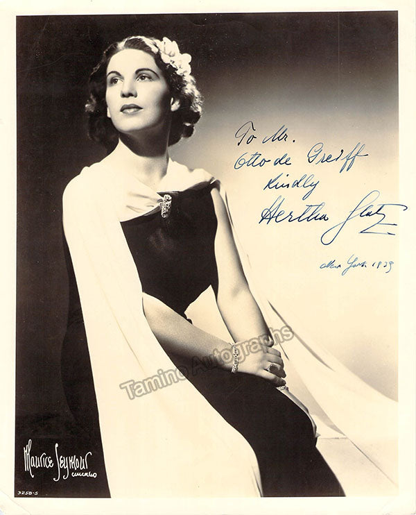 Austrian contralto (1908-2006), signed photograph, shown as herself, inscribed to noted Colombian Musicologist Otto de Greif, dated in New York in 1939. Photo by Maurice Seymour, Chicago. Bold handwriting and signature. Size is 8 x 10 inches, some creases on the edges of the photo, otherwise in excellent condition.