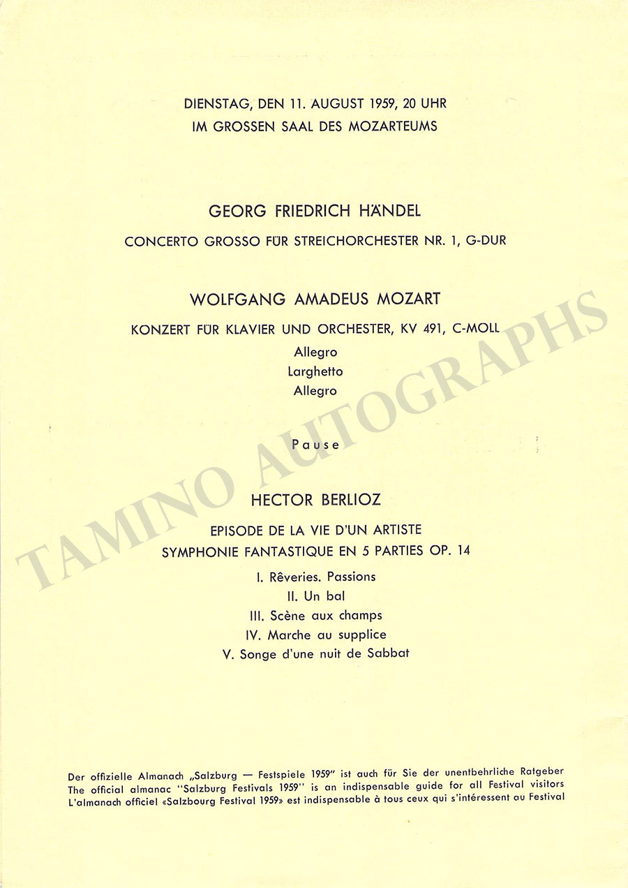 Set of 2 unsigned concert programs for performances of the famous Canadian pianist at the Salzburg Festival in 1959.