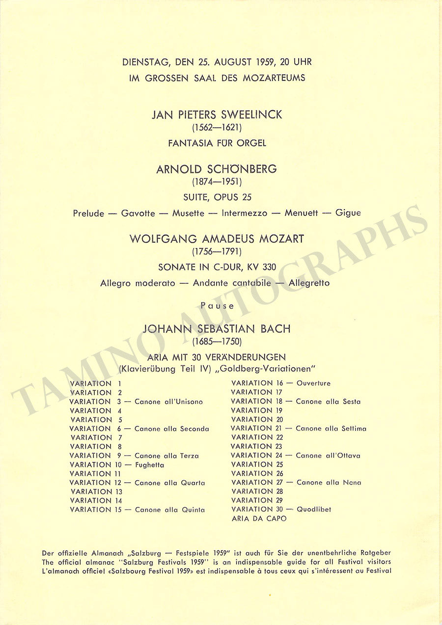 Gould, Glenn - Set of 2 Unsigned Concert Programs Salzburg 1959
