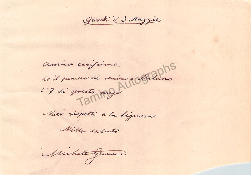 Autograph note signed, from the time Glinka was in Italy, in Italian, telling a friend about his upcoming visit to Milan, written in May, no year but certainly from the 1850s.