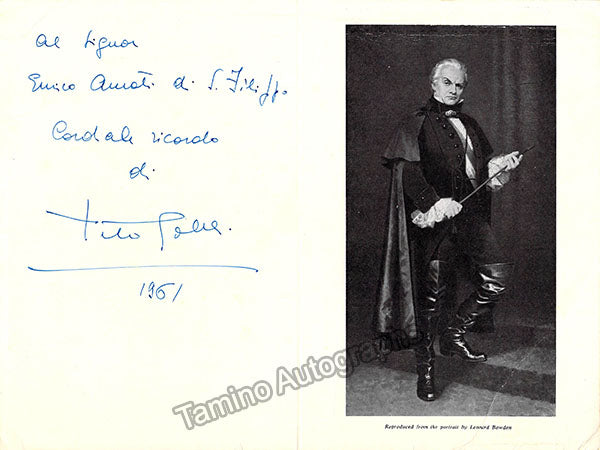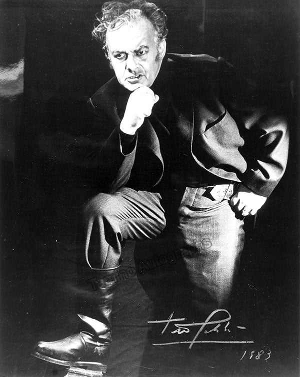 Signed card containing photograph, shown as Scarpia in Puccini's Tosca, perhaps his most celebrated role. Inscribed and dated in 1961. Half-tone photo is reproduced from a portrait by Leonard Bowden. Size is 7.5 x 10 inches, small creases on edges, otherwise in very good condition.