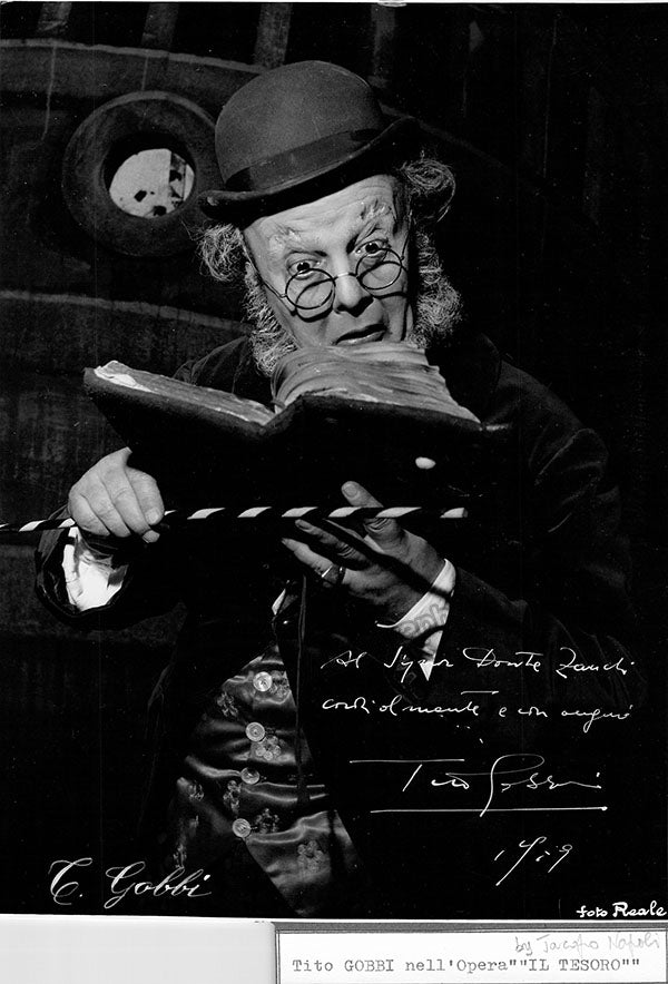 Signed photograph, shown as Iago in Verdi's Otello, dated in 1957. Size is 4.25 x 5.5 inches, slight paper loss on edges, otherwise in excellent condition.