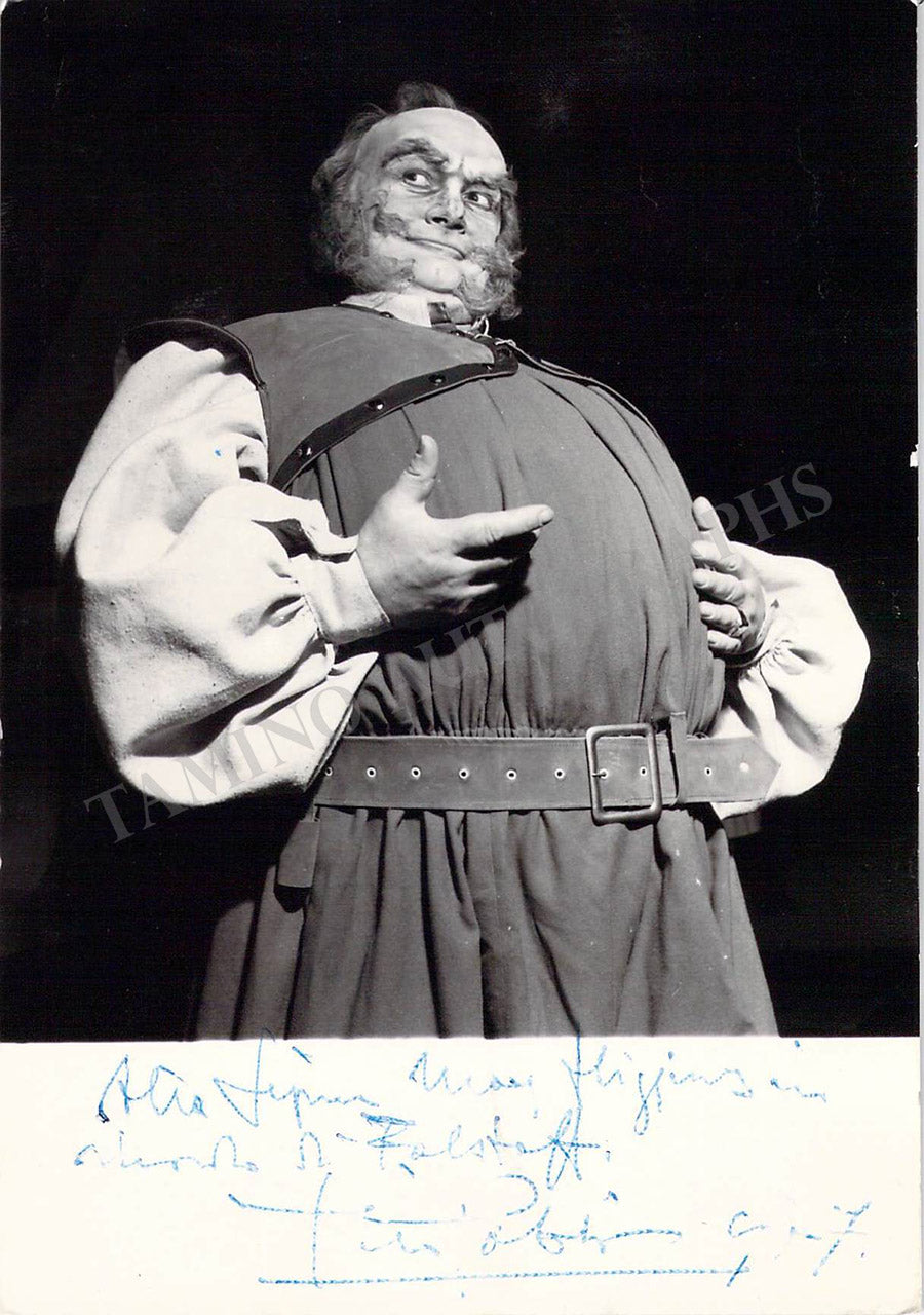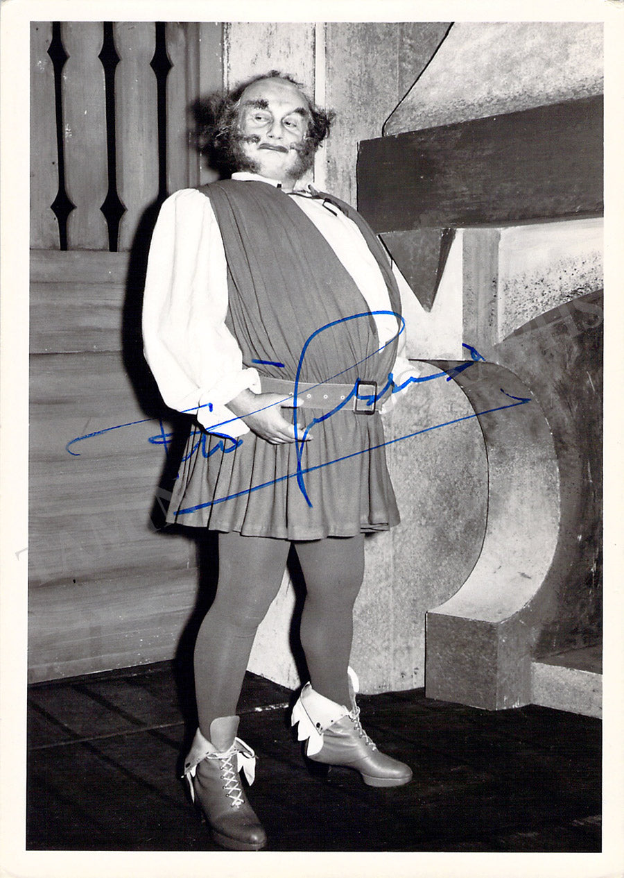 Signed photograph, shown in the title role of Verdi's Falstaff, inscribed and dated in 1957. Size is 4 x 5.75 inches, in very good condition.