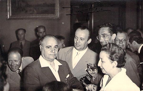 Signed photograph, shown at a reception at the Paris Opera in 1958. Stamped on verso by Pathe Marconi photographers, Paris. Size is 7.25 x 9.5 inches, in very good condition.