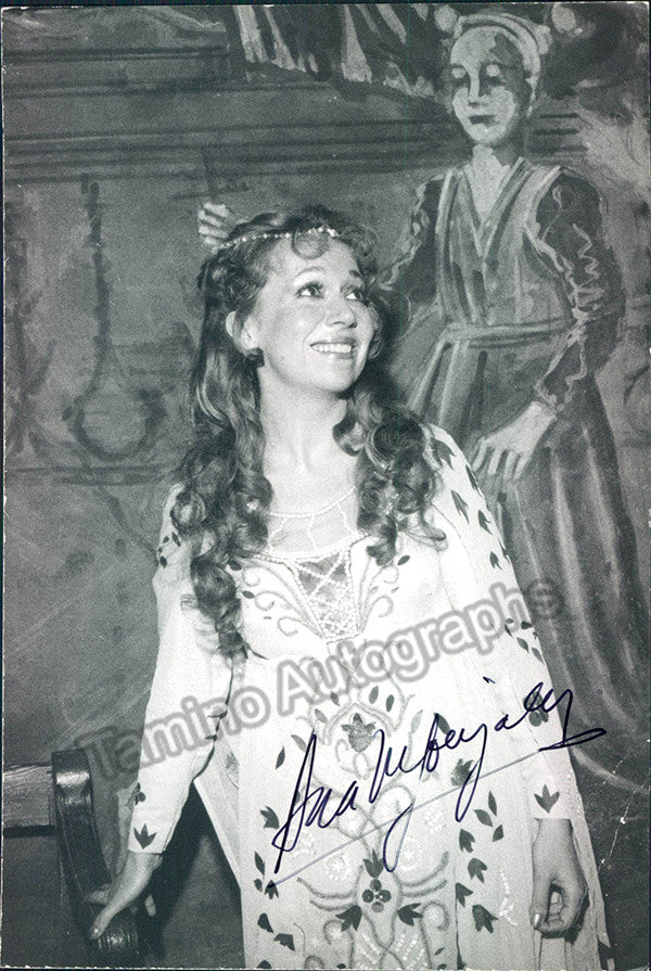Spanish soprano (b.1951), signed photo, shown as Juliette in Romeo et Juliette, stamped on verso by photographer Miguel Macciche, Buenos Aires. MInor creases in the lower right corner, otherwise in very good condition. Size is 4.75 x 7 inches.
