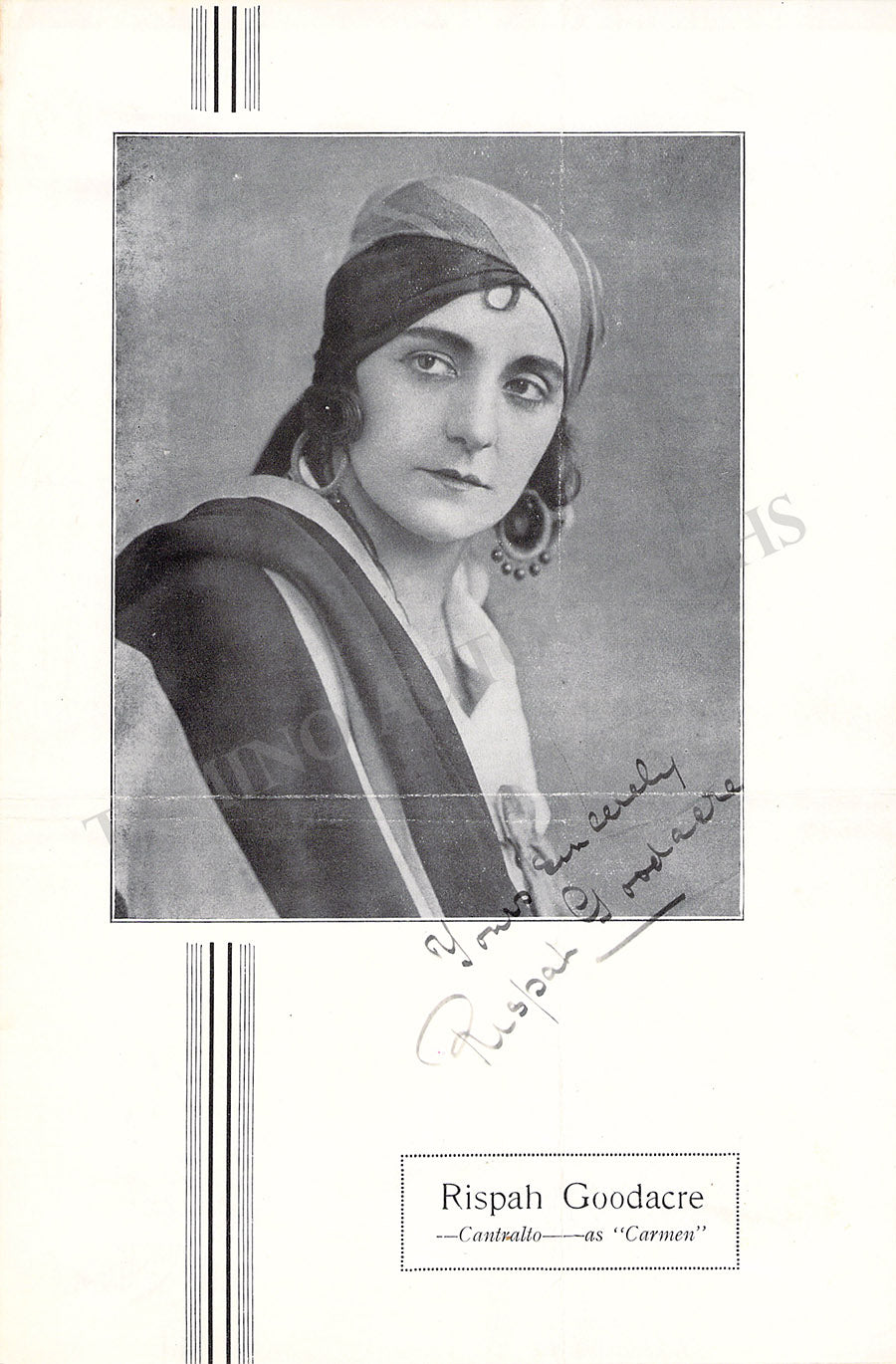 Mezzo-soprano active in the 1920s and 30s with a number of English and Scottish opera companies. Signed photograph (most likely taken from a larger program), showing her in the title role of Bizet's Carmen. 5.75 x 8.5 inch item which folds, some mounting traces on verso, otherwise in very good condition.
