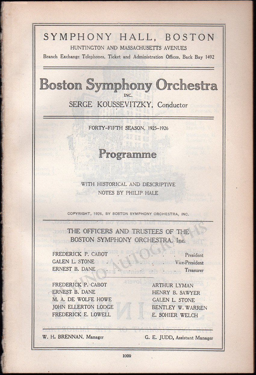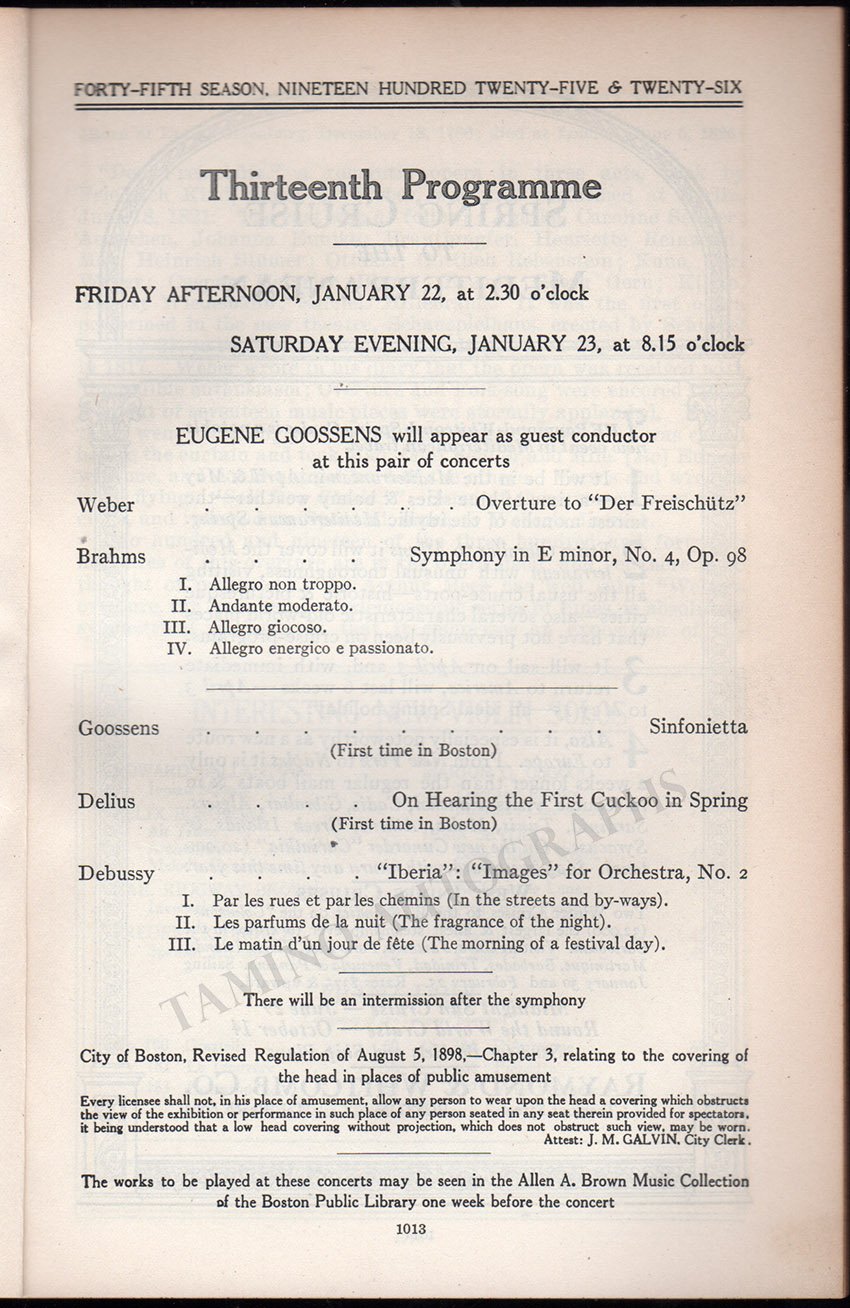 Two programs for concerts with the Boston Symphony Orchestra at Symphony Hall, one on Jan 23rd, 1926, another on Jan 25th, 1930. Goosens conducts in both concerts, and both include a piece by him. Both programs are missing covers, and are 5.4 x 8.1 inches, in very good condition.