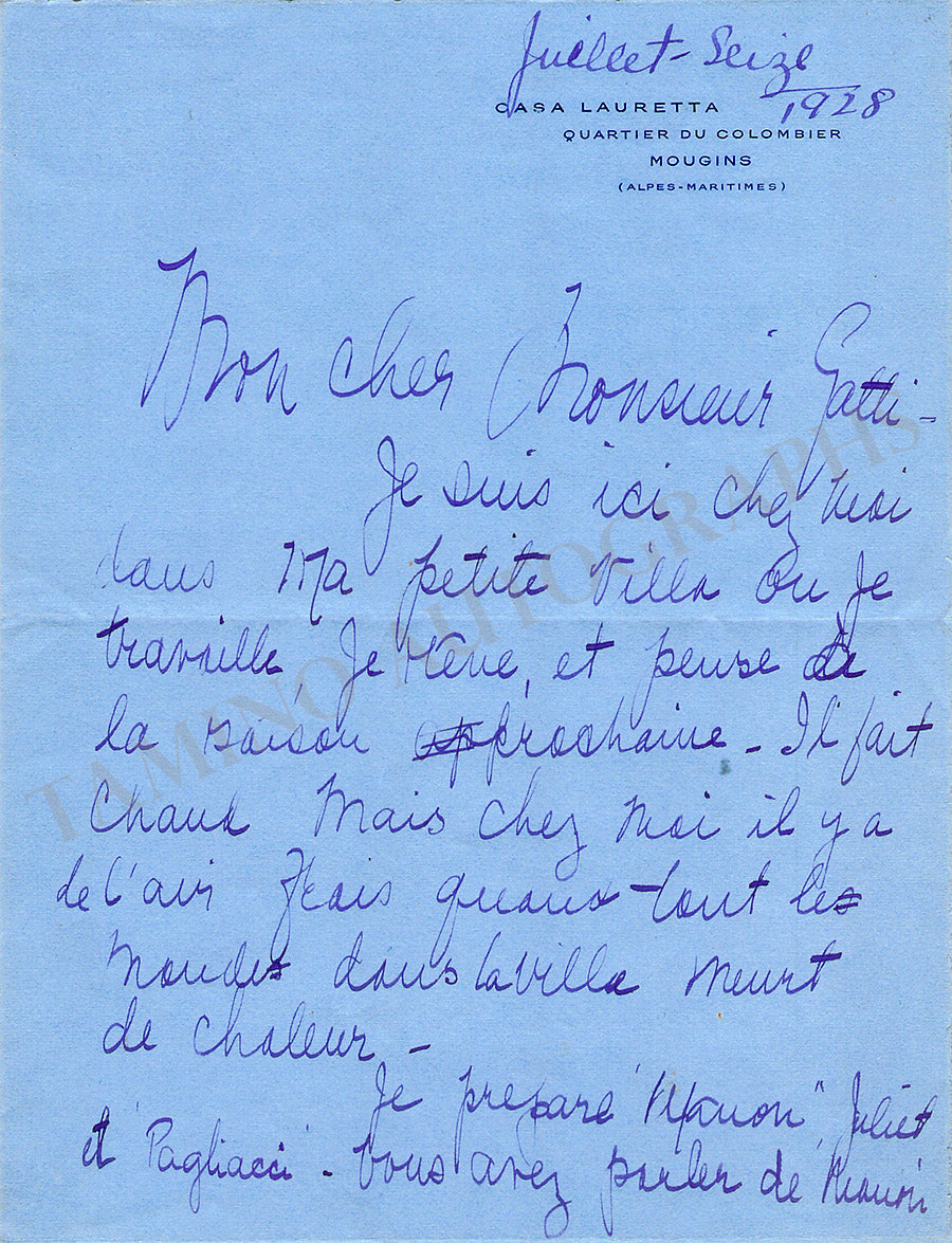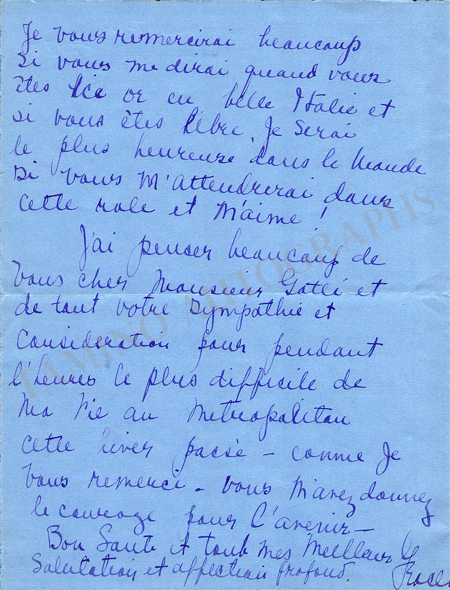 Autograph letter in French signed by her, dated 1928, addressed to the manager of the Metropolitan Opera, Giulio Gatti-Casazza (1869-1940) about professional matters: