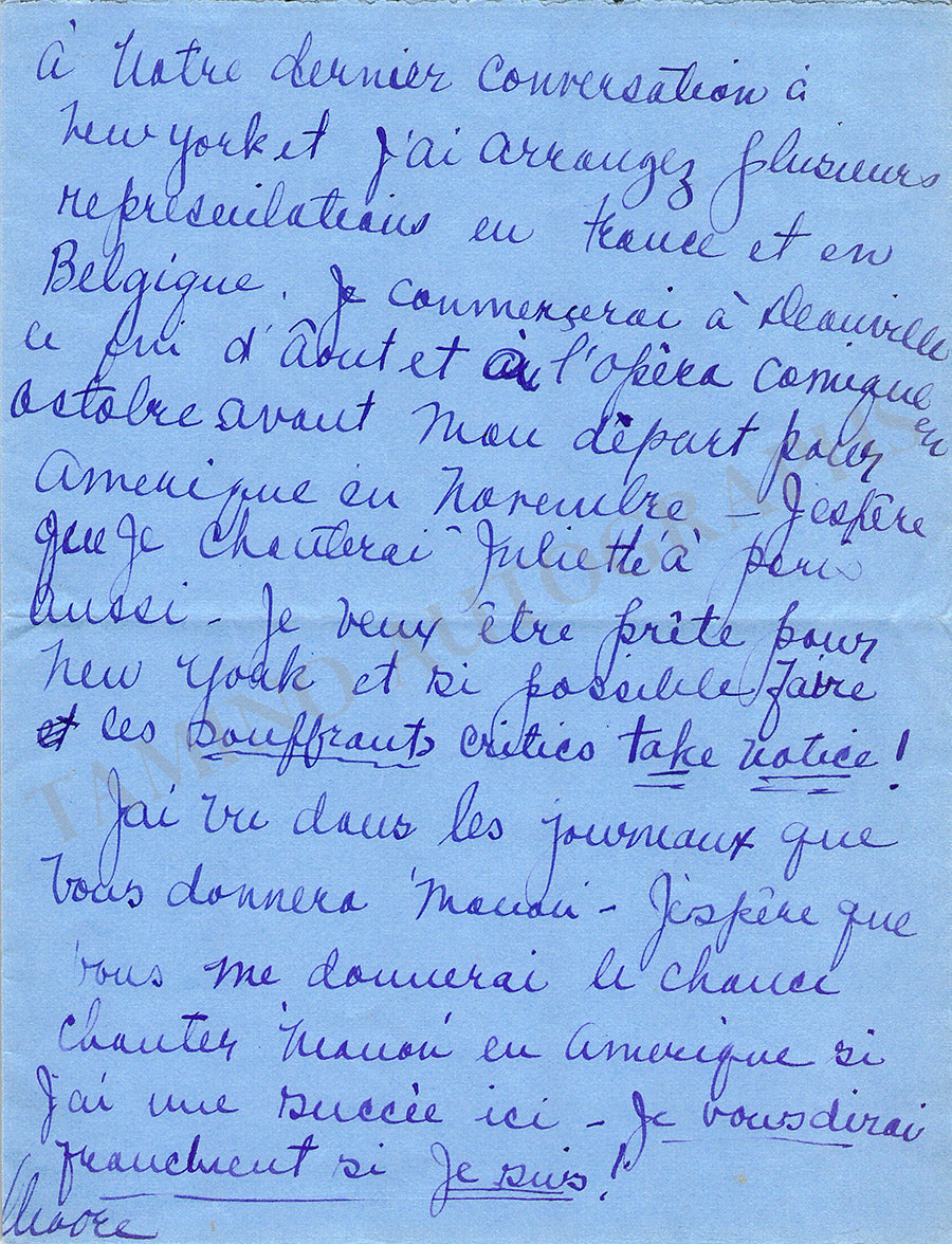 “…je prepare ‘Manon’, ‘Juliet’ et ‘Pagliacci’ – vous avez parlez de ‘Manon’ à notre dernier conversation à New York et j’ai arrangez plusieurs representations en France et en Belgique (…) J’espère que je chanterai ‘Juliette’ à Paris aussi – je veux être prête pour New York et si possible faire les souffrants critics take notice!…”.
