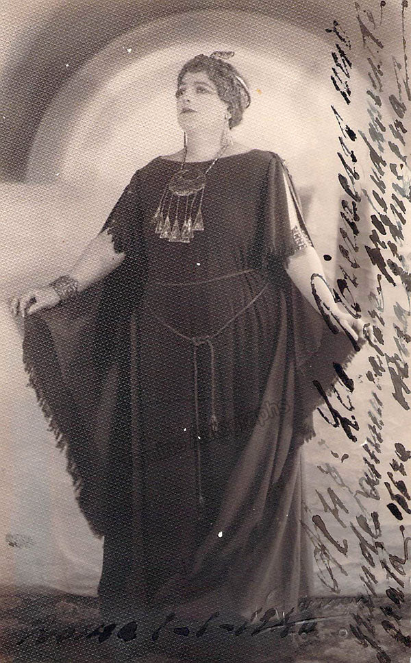 Italian mezzo-soprano (1880-1965), signed postcard photograph, shown in role, inscribed and dated in 1940. Blind stamped on front by photographer. Size is 3.25 x 5.25 inches, in very good condition.