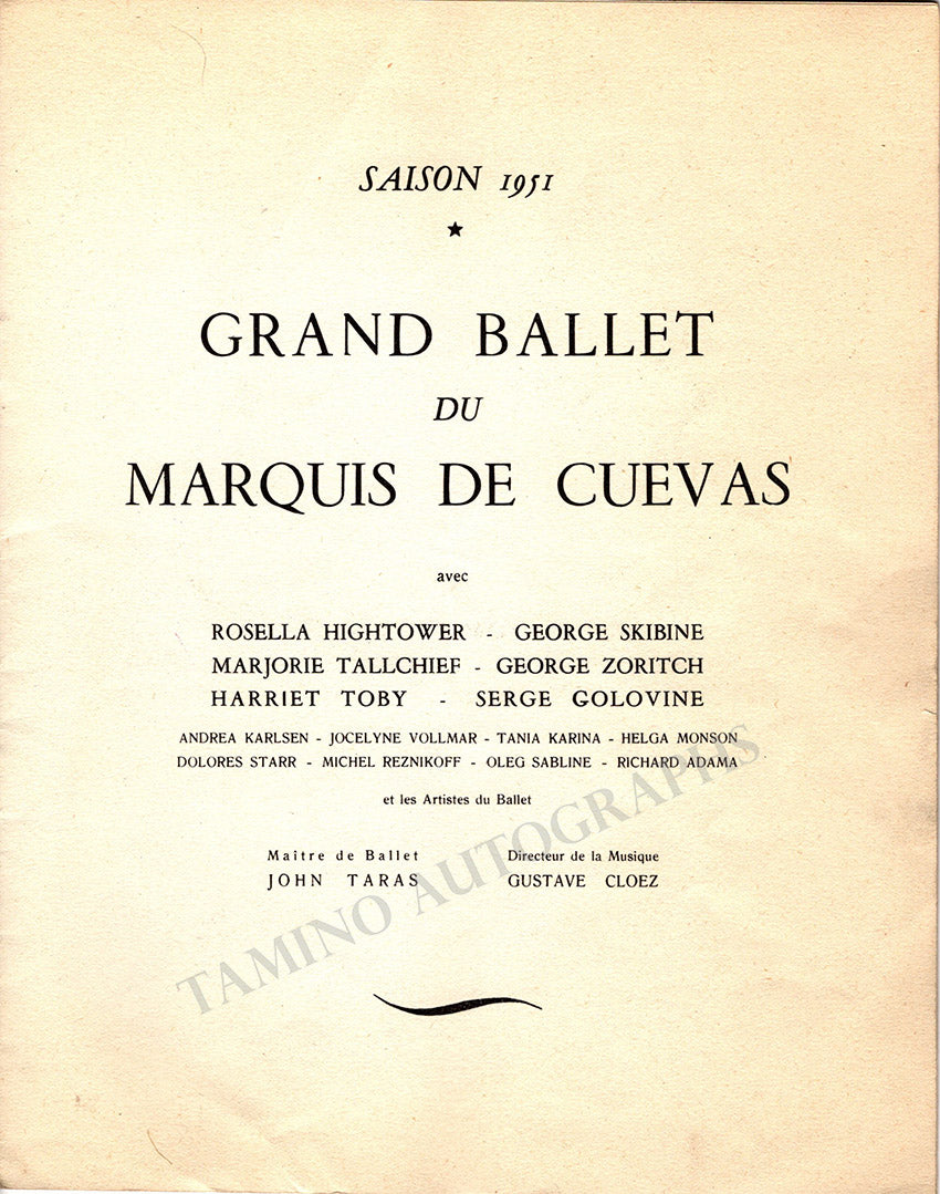 Season program for the Grand Ballet du Marquis de Cuevas company listing all the ballet performances for the 1951 season, including pictures of some of the performers.  Size is 8.3 x 10.6 inches, central fold, otherwise in very good condition.