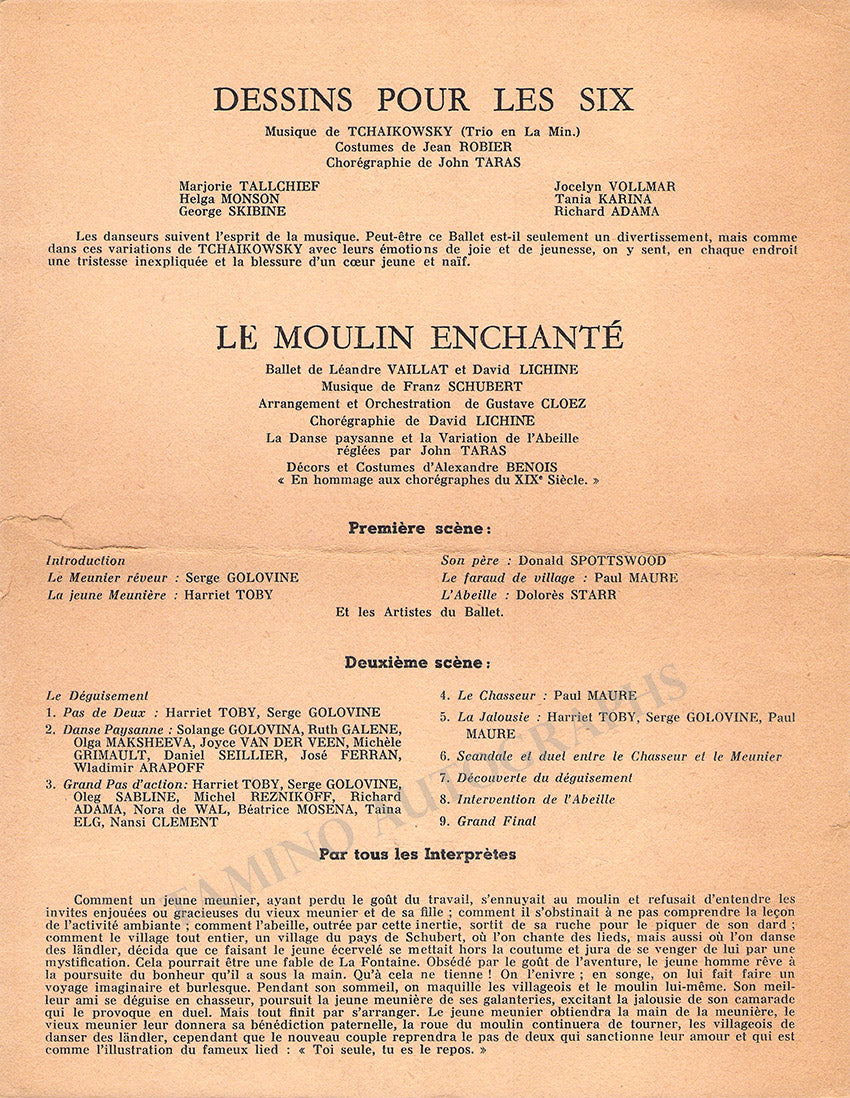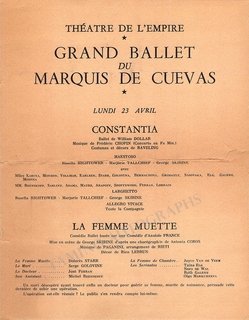 ALSO INCLUDED are two playbills for performances at the Theatre de L'Empire, Paris, May 1951 (one of them with lipstick markings). Size is 6.1 x 9.6 inches each, in excellent condition.