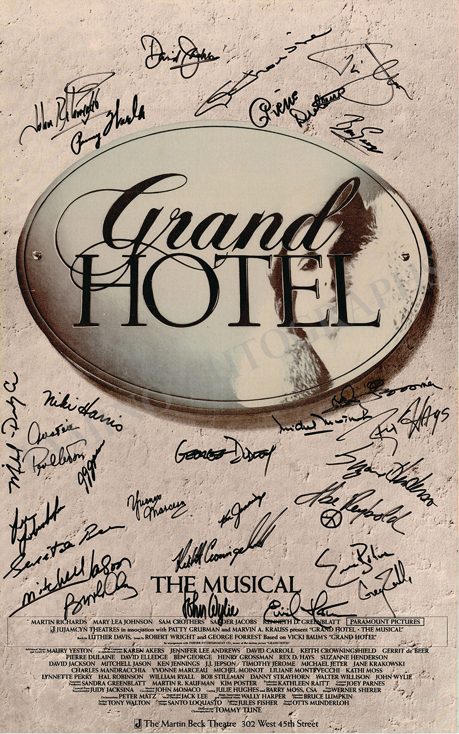 Original poster for a Broadway production of the musical Grand Hotel at The Martin Beck Theatre, signed by many members of the cast.
